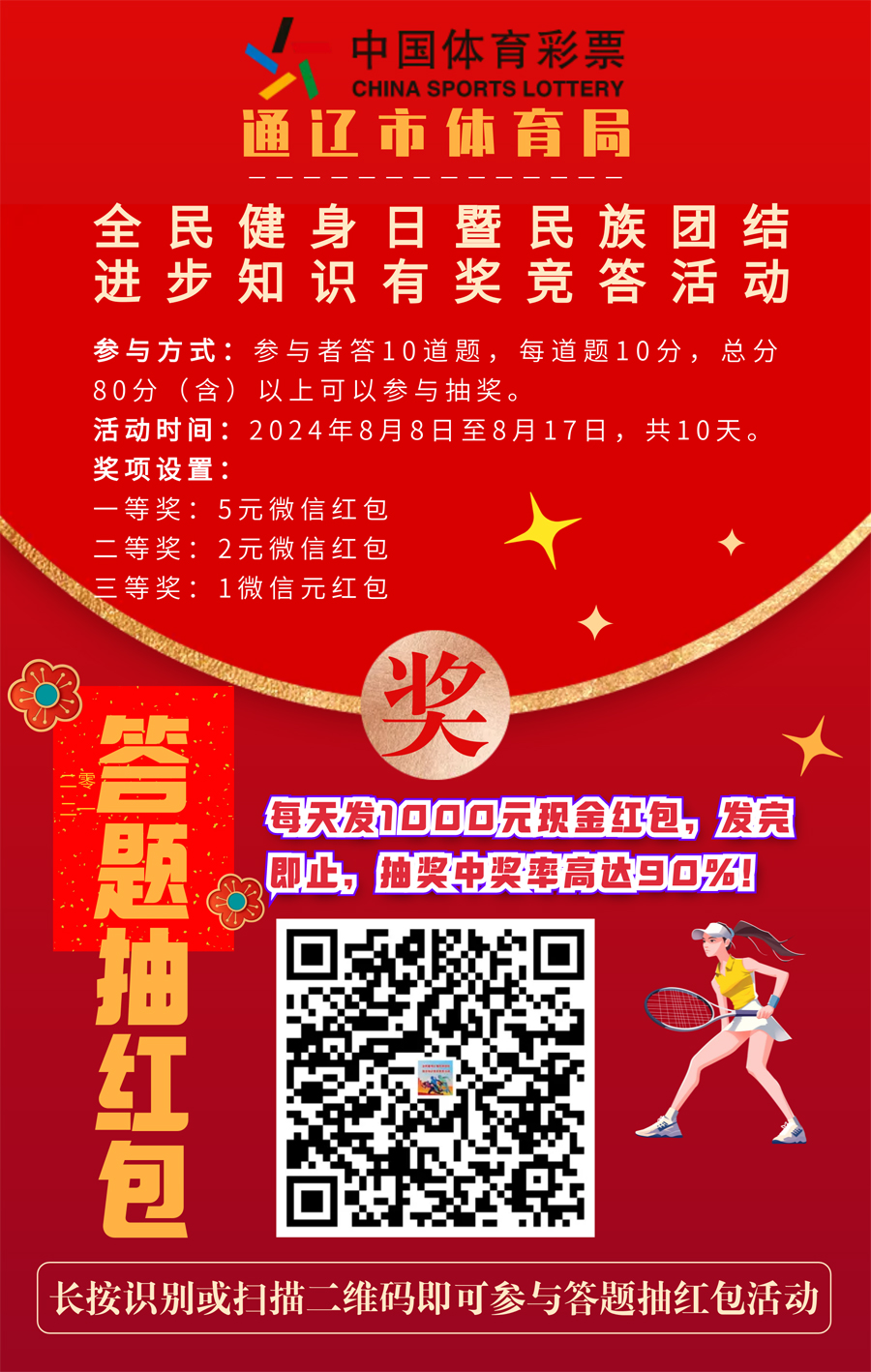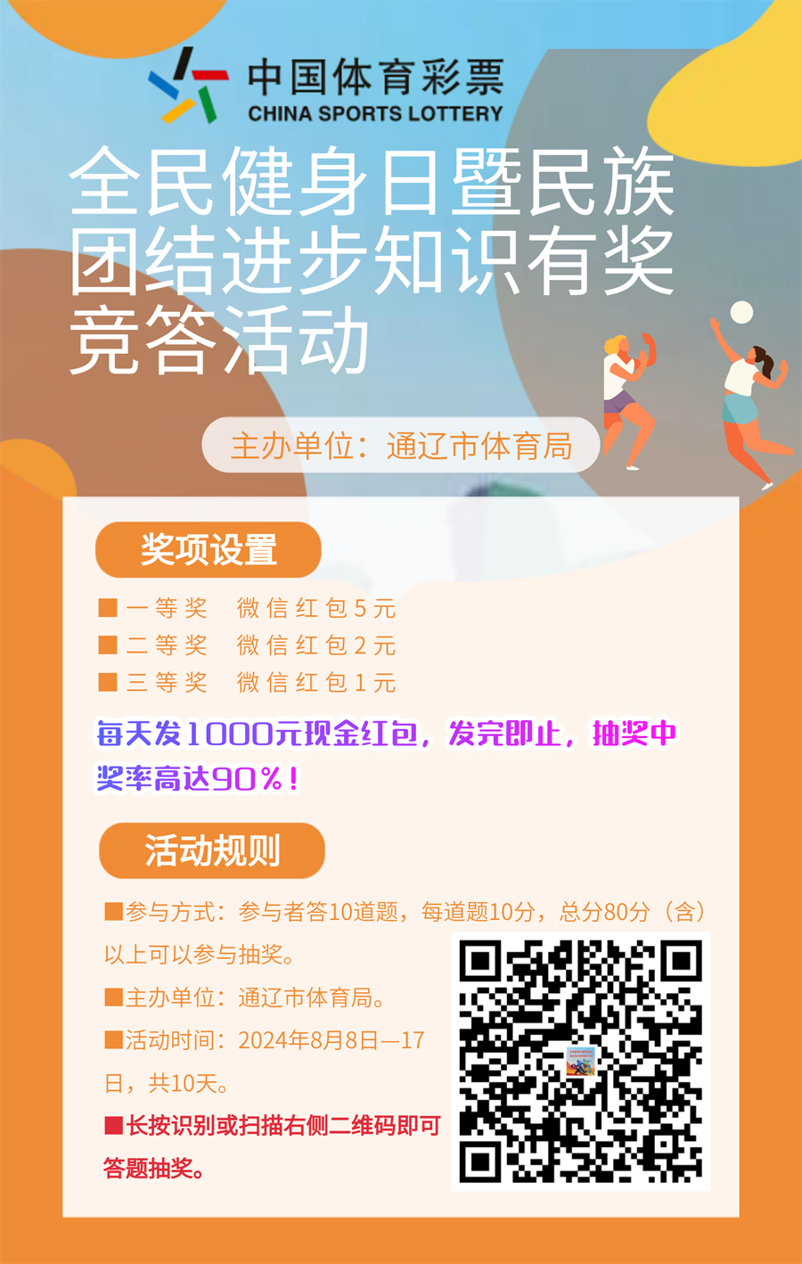 2024年8月5日,通遼市大尚網(wǎng)絡(luò)技術(shù)服務(wù)有限公司與通遼市體育局達(dá)成合作協(xié)議,大尚網(wǎng)絡(luò)公司負(fù)責(zé)通遼市體育局“全民健身日暨民族團(tuán)結(jié)進(jìn)步知識(shí)有獎(jiǎng)競(jìng)答活動(dòng)”系統(tǒng)開(kāi)發(fā)制作工作,活動(dòng)正在進(jìn)行中,敬請(qǐng)期待。