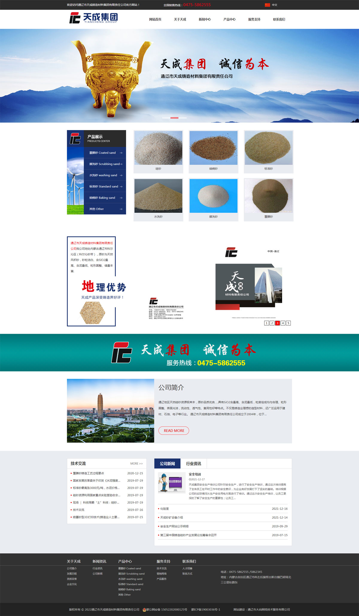 通遼市天成鑄造材料集團有限責任公司成立于2004年,位于科爾沁大草原的科爾沁砂帶,東北交通樞紐,這里交通便利、環(huán)境優(yōu)美、景色宜人。礦區(qū)位于通遼市科爾沁左翼后旗努古斯臺鎮(zhèn),礦區(qū)占地面積為0.0246平方公里臨近北京市、河北省、遼寧省距離錦州港300公里左右。公司現有員工100人左右,工程技術人員30余人。年產覆膜砂5萬多噸:年產擦洗砂、水洗砂等其它品種30余萬噸。